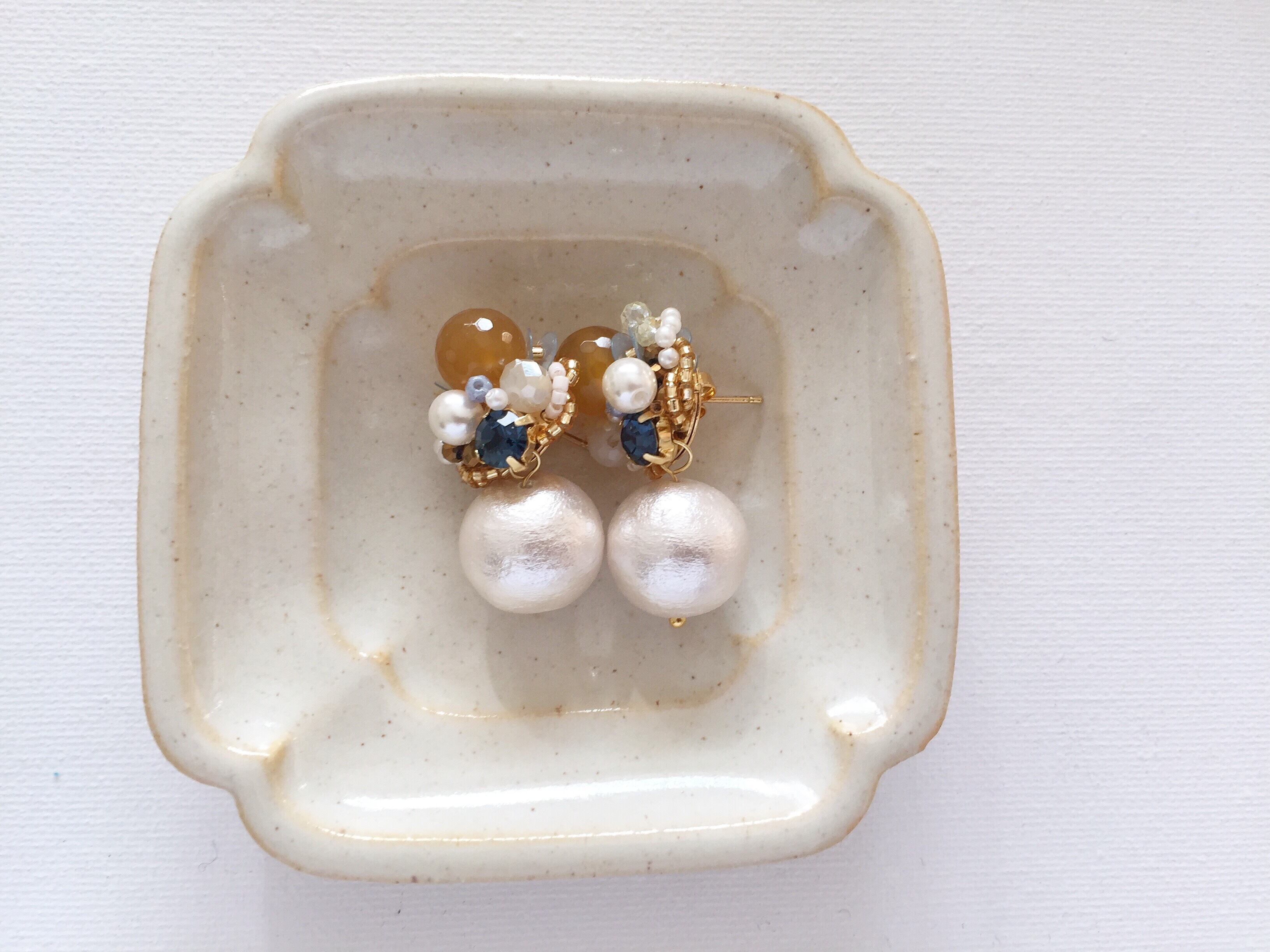 大きな黄色の石はイエローメノウ。パールとネイビーのビジューを合わせて落ち着いた色合いにしました。