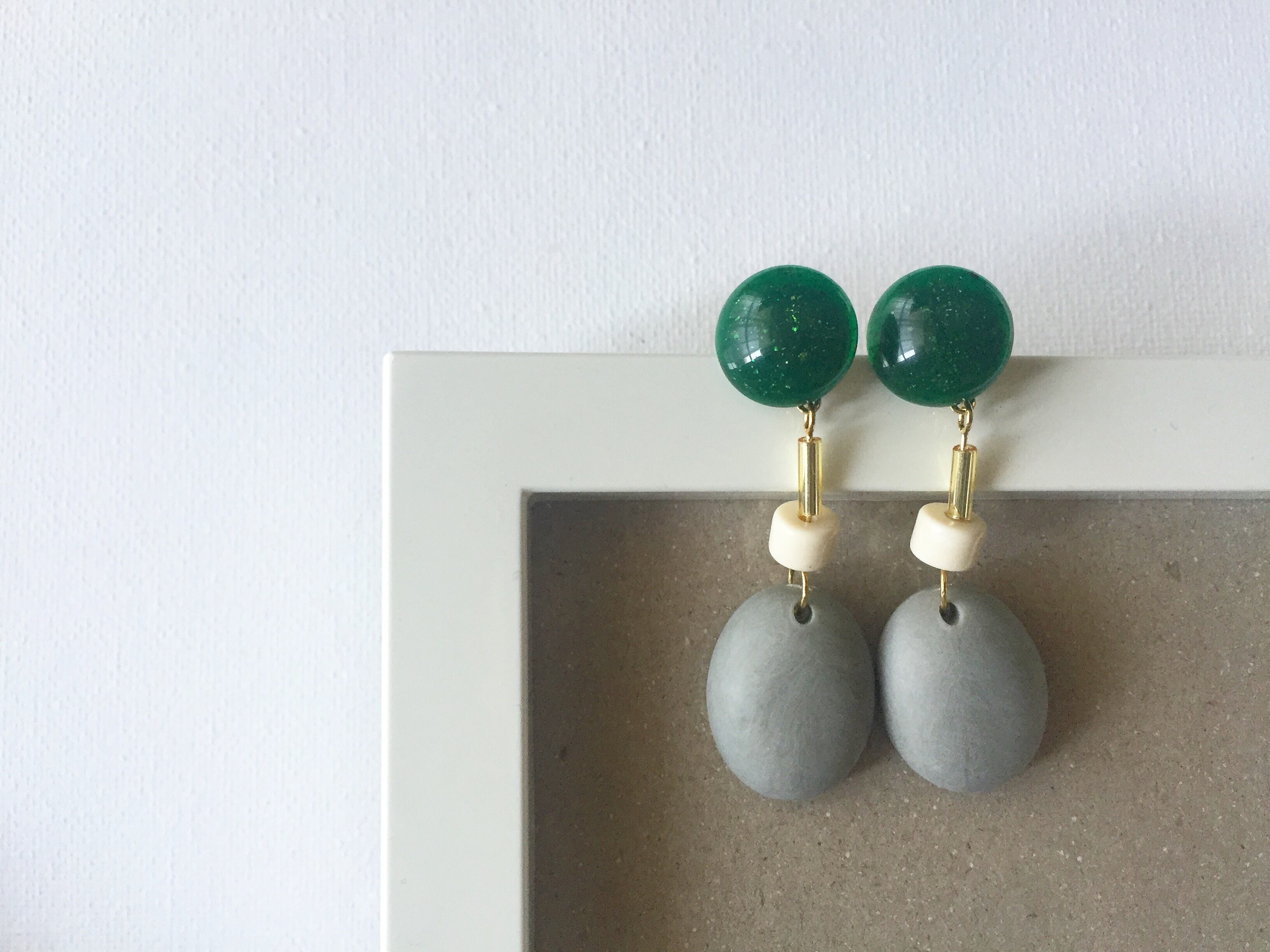 緑色のカボションにマットなグレーのオーバルビーズを合わせたピアスです。