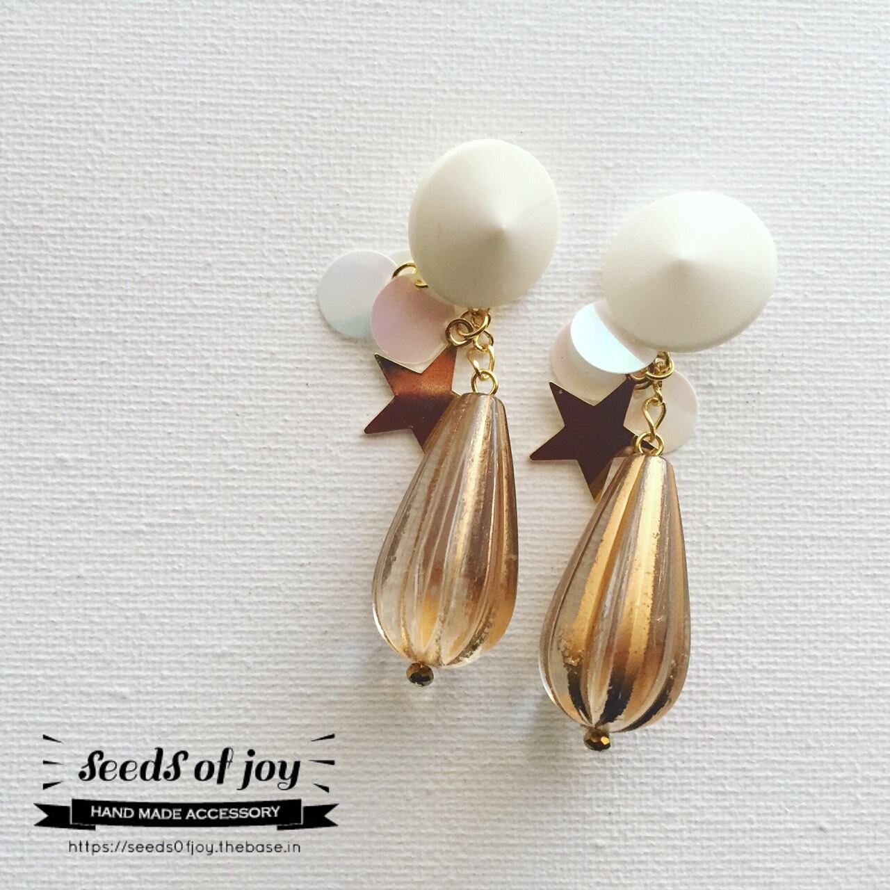 白いボタンにドロップビーズとスパンコール、星のモチーフを合わせた可愛いデザインのピアスです。