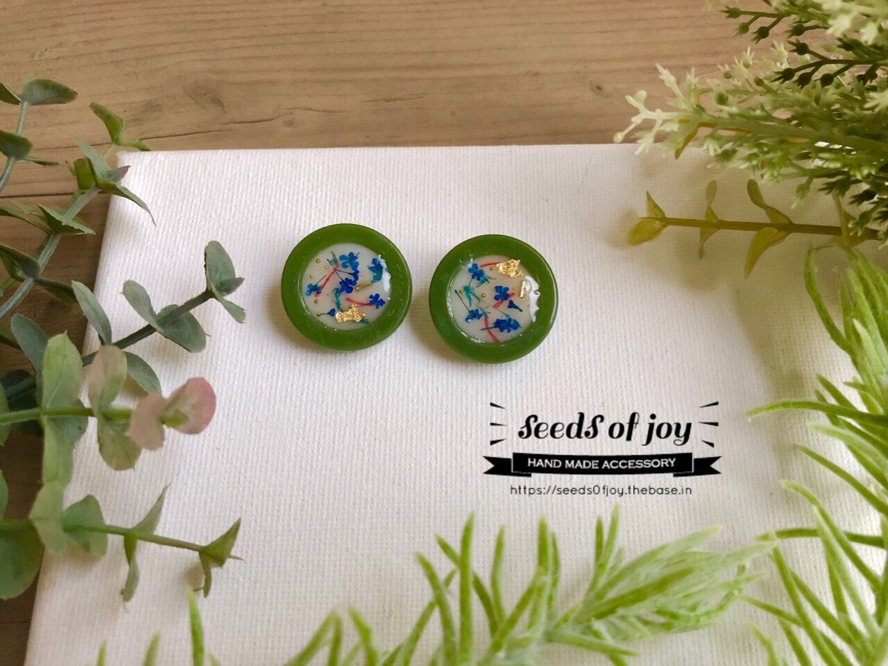春色の輪っかに本物のドライフラワーやビーズを散りばめた華やかなピアスです。