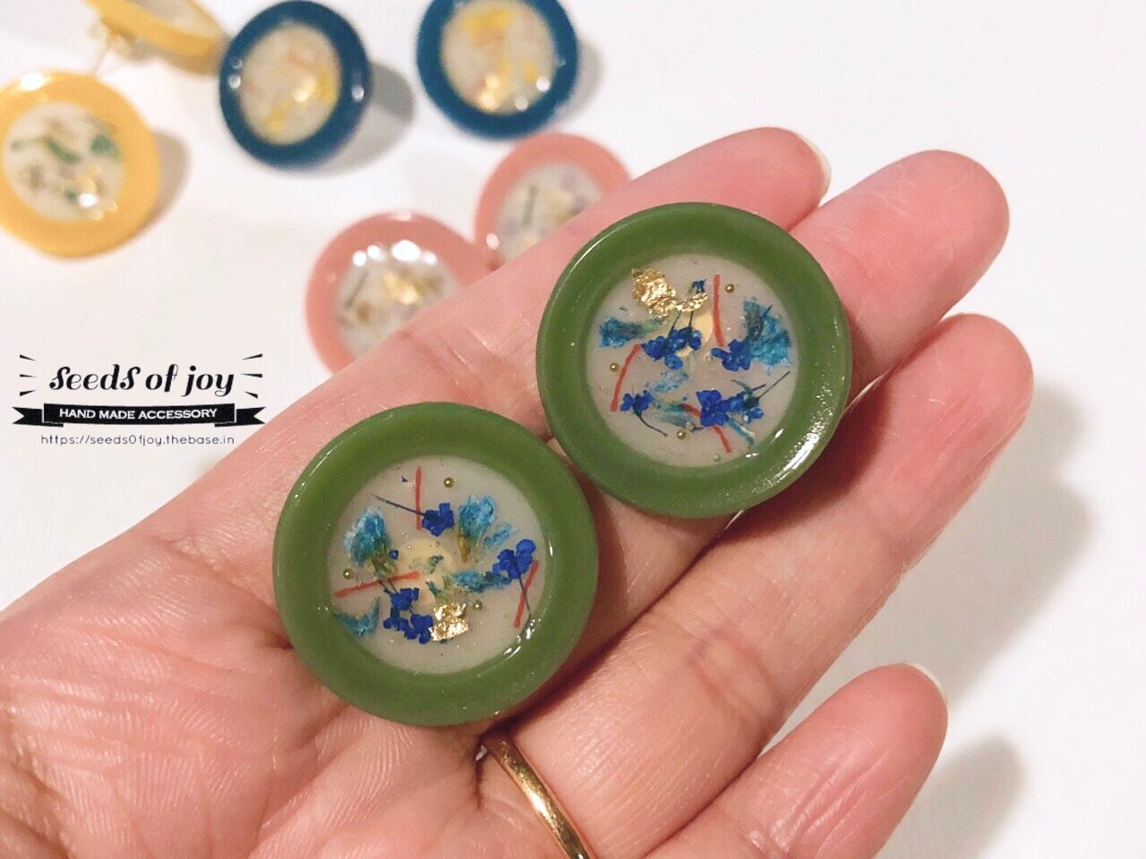 春色の輪っかに本物のドライフラワーやビーズを散りばめた華やかなピアスです。